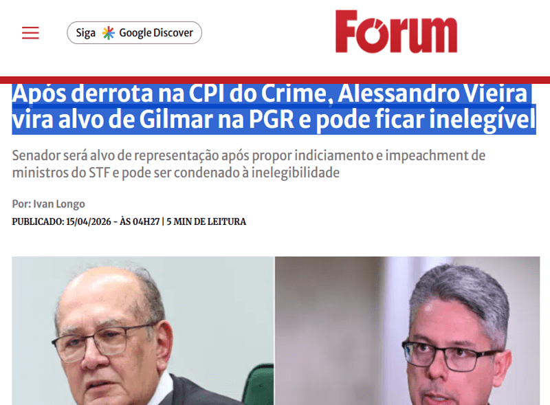 O ministro do Supremo Tribunal Federal (STF), Gilmar Mendes, decidiu acionar a Procuradoria-Geral da República (PGR) contra o senador Alessandro Vieira, sob a acusação de abuso de autoridade. A medida ocorre após a apresentação — e posterior rejeição — do relatório final da CPI do Crime Organizado, nesta terça-feira (14), que propunha o indiciamento de magistrados da própria Corte. A representação deve ser formalizada nos próximos dias e tem como base o entendimento de Gilmar Mendes de que houve “desvio de finalidade” por parte do parlamentar. Para o decano do STF, o uso da comissão parlamentar para atacar ministros configura violação da Lei de Abuso de Autoridade e exige apuração rigorosa por parte do Ministério Público. O movimento aprofunda uma crise institucional que já vinha se desenhando nos bastidores de Brasília e que ganhou contornos públicos com a derrota do relatório de Vieira na comissão.